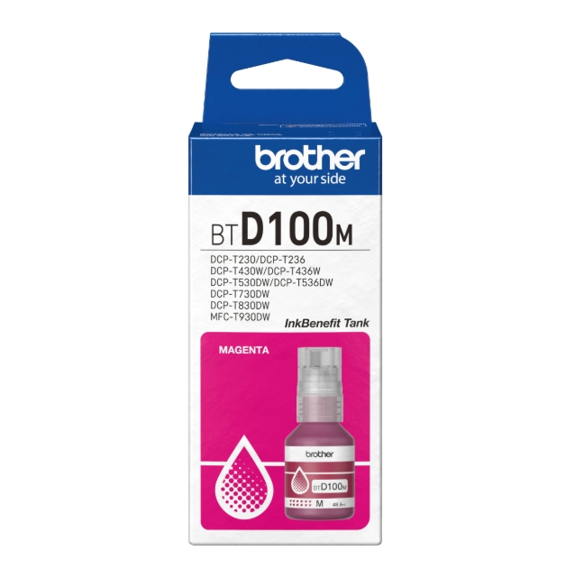 Оригиналната бутилка с мастило Brother BTD100М е специално разработена, за да Ви осигури качествени документи всеки път, когато печатате. С изключително големия капацитет от 5000 страници, можете да сложите край на редовното допълване на мастило, просто заредете резервоара за мастило и се наслаждавайте на дълготраен качествен печат.