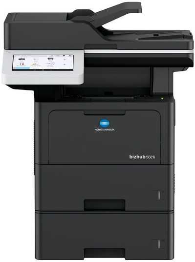Konica Minolta bizhub 5021i е нов модел високоскоростен A4 черно-бял печат с 50 стр./мин, резолюция на печат 1200 dpi, стандартен печат на баркодове, стандартна Wi-Fi връзка, поддръжка на мобилен печат, включително AirPrint за директен печат от мобилни устройства.